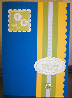 For this one I have used Rose Red, Kiwi Kiss, Whisper White and Night of Navy C/S. Large and Small Star Punch's, Eyelet Border Punch, Rose Red Double Stitched Grosgrain Ribbon and a Rose Red Brad. I have layered the sentiment from "On Your Birthday" using Kiwi Kiss, Rose Red and Night of Navy Ink and shadowed them using the "Stamp a-ma-jig".